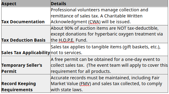Approximately 90% of auction items are NOT tax-deductible. Only specific donations for hyperbaric oxygen through the H.O.P.E. Fund may be deductible.